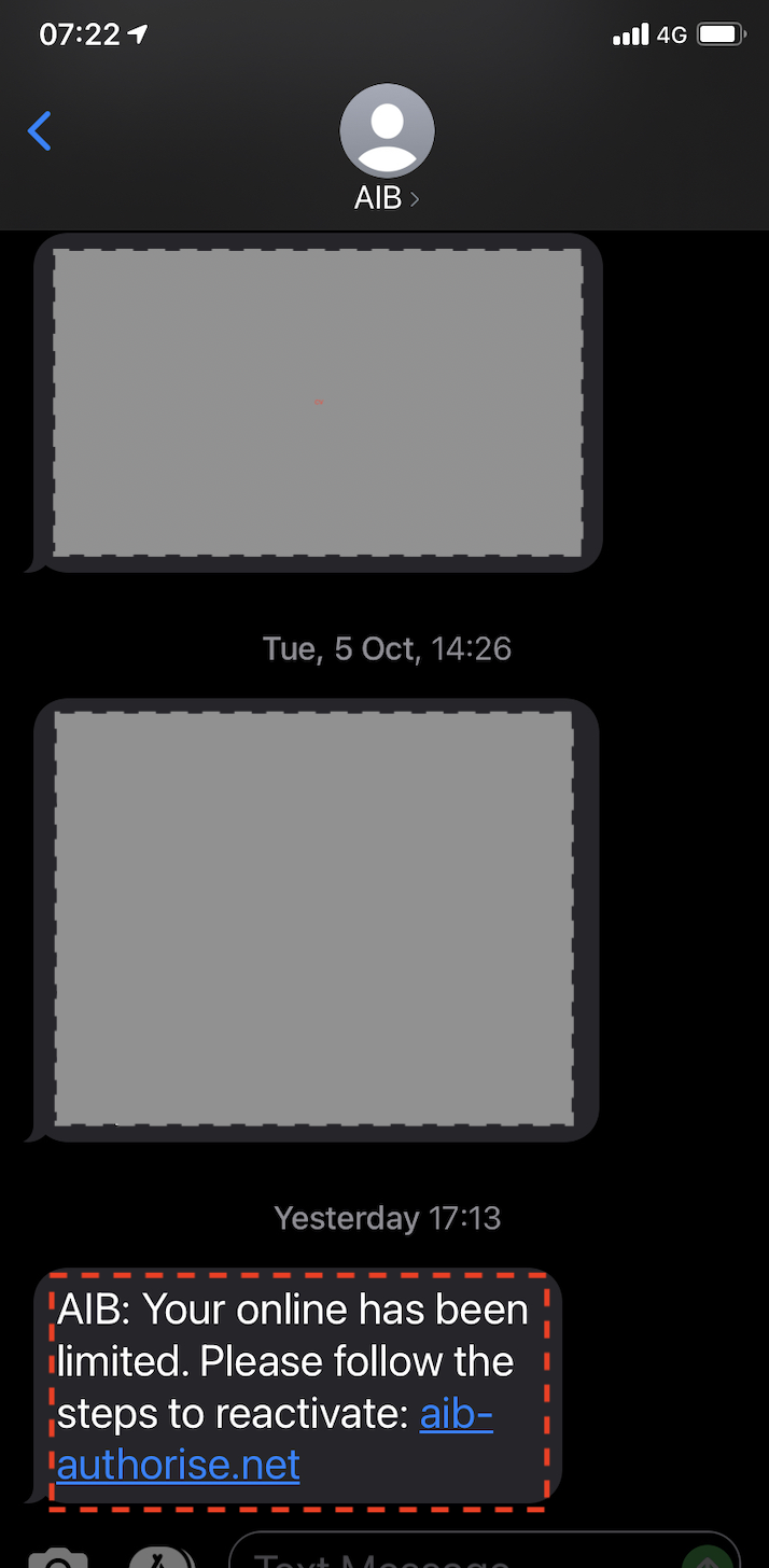 The message has appeared within the list of genuine SMS messages that were received from AIB. It is no different than a criminal posting you a letter that uses the AIB letterhead. You can’t trust the source of a letter. You can’t trust the source of an SMS message.
